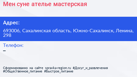 Мен суне, ателье-мастерская по адресу 693006, Сахалинская область, Южно-Сахалинск, Ленина, 298 в дальнейшем Организация, размещена в следующих категориях: