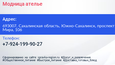 Модница, ателье по адресу 693007, Сахалинская область, Южно-Сахалинск, проспект Мира, 106 в дальнейшем Организация, размещена в следующих категориях: