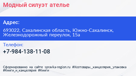 Модный силуэт, ателье по адресу 693022, Сахалинская область, Южно-Сахалинск, Железнодорожный переулок, 15а в дальнейшем Организация, размещена в следующих категориях: