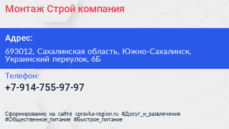 Монтаж-Строй, компания по адресу 693012, Сахалинская область, Южно-Сахалинск, Украинский переулок, 6Б в дальнейшем Организация, размещена в следующих категориях: