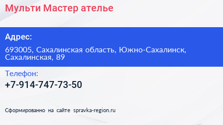 Мульти Мастер, ателье по адресу 693005, Сахалинская область, Южно-Сахалинск, Сахалинская, 89 в дальнейшем Организация, размещена в следующих категориях: