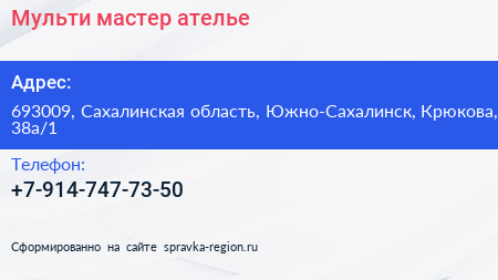 Мульти мастер, ателье по адресу 693009, Сахалинская область, Южно-Сахалинск, Крюкова, 38а/1 в дальнейшем Организация, размещена в следующих категориях: