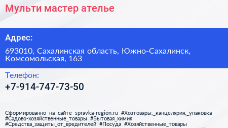 Мульти мастер, ателье по адресу 693010, Сахалинская область, Южно-Сахалинск, Комсомольская, 163 в дальнейшем Организация, размещена в следующих категориях: