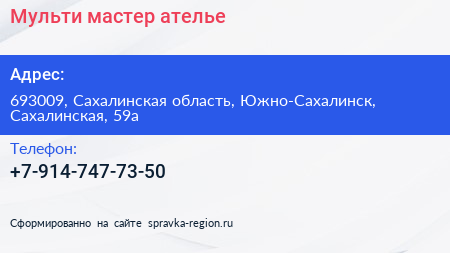 Мульти мастер, ателье по адресу 693009, Сахалинская область, Южно-Сахалинск, Сахалинская, 59а в дальнейшем Организация, размещена в следующих категориях:
