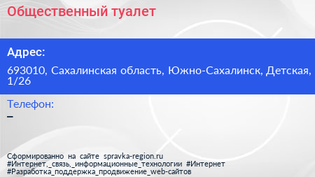 Общественный туалет по адресу 693010, Сахалинская область, Южно-Сахалинск, Детская, 1/26 в дальнейшем Организация, размещена в следующих категориях: