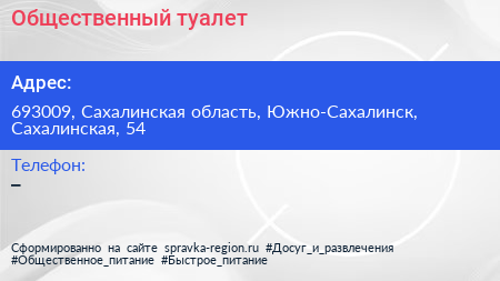 Общественный туалет по адресу 693009, Сахалинская область, Южно-Сахалинск, Сахалинская, 54 в дальнейшем Организация, размещена в следующих категориях: