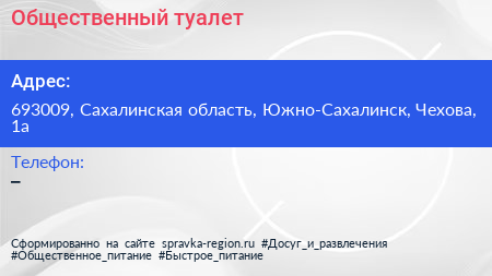 Общественный туалет по адресу 693009, Сахалинская область, Южно-Сахалинск, Чехова, 1а в дальнейшем Организация, размещена в следующих категориях: