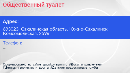 Общественный туалет по адресу 693023, Сахалинская область, Южно-Сахалинск, Комсомольская, 259в в дальнейшем Организация, размещена в следующих категориях: