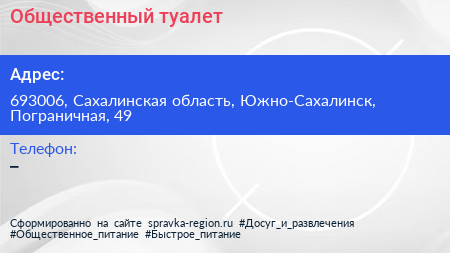 Общественный туалет по адресу 693006, Сахалинская область, Южно-Сахалинск, Пограничная, 49 в дальнейшем Организация, размещена в следующих категориях: