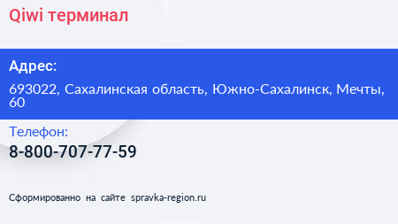 Qiwi, терминал по адресу 693022, Сахалинская область, Южно-Сахалинск, Мечты, 60 в дальнейшем Организация, размещена в следующих категориях: