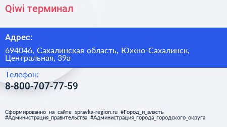 Qiwi, терминал по адресу 694046, Сахалинская область, Южно-Сахалинск, Центральная, 39а в дальнейшем Организация, размещена в следующих категориях: