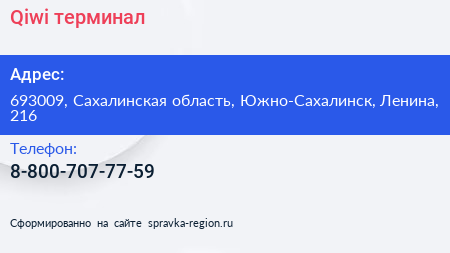 Qiwi, терминал по адресу 693009, Сахалинская область, Южно-Сахалинск, Ленина, 216 в дальнейшем Организация, размещена в следующих категориях: