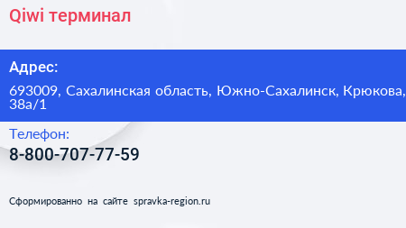 Qiwi, терминал по адресу 693009, Сахалинская область, Южно-Сахалинск, Крюкова, 38а/1 в дальнейшем Организация, размещена в следующих категориях: