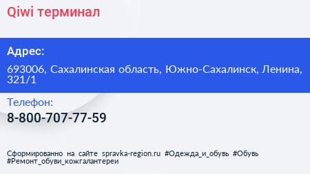 Qiwi, терминал по адресу 693006, Сахалинская область, Южно-Сахалинск, Ленина, 321/1 в дальнейшем Организация, размещена в следующих категориях: