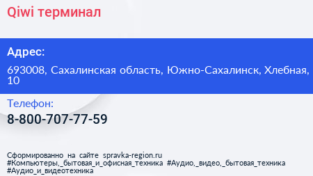 Qiwi, терминал по адресу 693008, Сахалинская область, Южно-Сахалинск, Хлебная, 10 в дальнейшем Организация, размещена в следующих категориях: