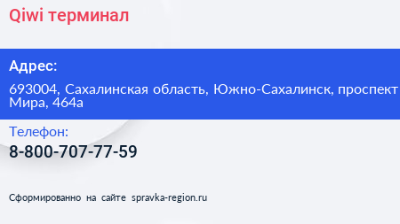 Qiwi, терминал по адресу 693004, Сахалинская область, Южно-Сахалинск, проспект Мира, 464а в дальнейшем Организация, размещена в следующих категориях: