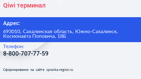 Qiwi, терминал по адресу 693010, Сахалинская область, Южно-Сахалинск, Космонавта Поповича, 18Б в дальнейшем Организация, размещена в следующих категориях:
