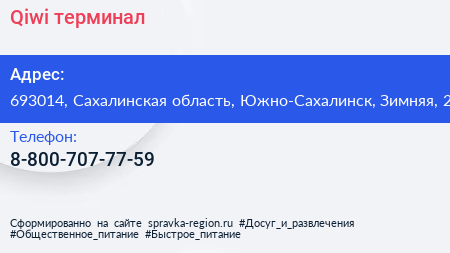 Qiwi, терминал по адресу 693014, Сахалинская область, Южно-Сахалинск, Зимняя, 2 в дальнейшем Организация, размещена в следующих категориях: