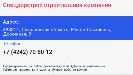 Спецдорстрой, строительная компания по адресу 693014, Сахалинская область, Южно-Сахалинск, Дорожная, 9 в дальнейшем Организация, размещена в следующих категориях: