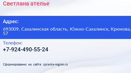 Светлана, ателье по адресу 693009, Сахалинская область, Южно-Сахалинск, Крюкова, 57 в дальнейшем Организация, размещена в следующих категориях: