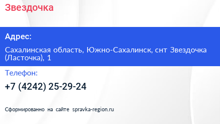 Звездочка по адресу Сахалинская область, Южно-Сахалинск, снт Звездочка (Ласточка), 1 в дальнейшем Организация, размещена в следующих категориях: