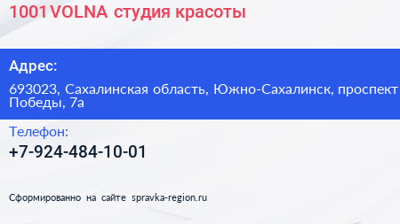1001 VOLNA, студия красоты по адресу 693023, Сахалинская область, Южно-Сахалинск, проспект Победы, 7а в дальнейшем Организация, размещена в следующих категориях: