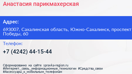 Анастасия, парикмахерская по адресу 693007, Сахалинская область, Южно-Сахалинск, проспект Победы, 60 в дальнейшем Организация, размещена в следующих категориях: