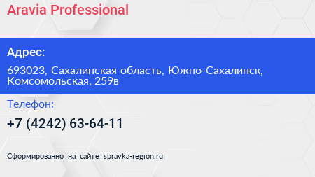 Aravia Professional по адресу 693023, Сахалинская область, Южно-Сахалинск, Комсомольская, 259в в дальнейшем Организация, размещена в следующих категориях: