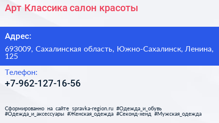 Арт-Классика, салон красоты по адресу 693009, Сахалинская область, Южно-Сахалинск, Ленина, 125 в дальнейшем Организация, размещена в следующих категориях: