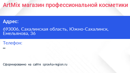 ArtMix, магазин профессиональной косметики по адресу 693006, Сахалинская область, Южно-Сахалинск, Емельянова, 36 в дальнейшем Организация, размещена в следующих категориях: