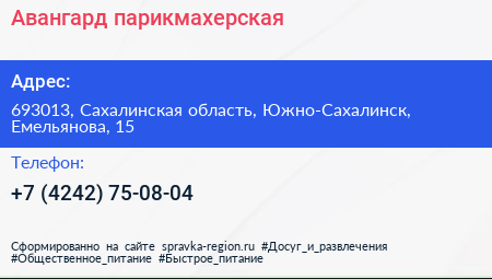 Авангард, парикмахерская по адресу 693013, Сахалинская область, Южно-Сахалинск, Емельянова, 15 в дальнейшем Организация, размещена в следующих категориях: