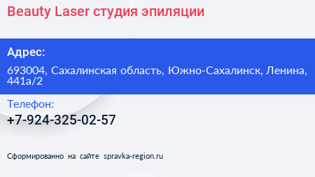 Beauty Laser, студия эпиляции по адресу 693004, Сахалинская область, Южно-Сахалинск, Ленина, 441а/2 в дальнейшем Организация, размещена в следующих категориях: