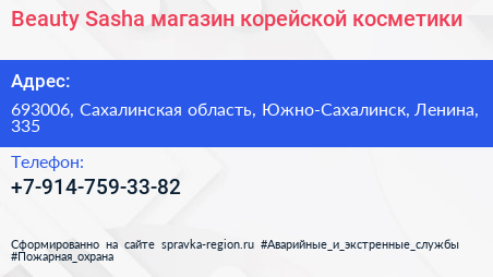 Beauty Sasha, магазин корейской косметики по адресу 693006, Сахалинская область, Южно-Сахалинск, Ленина, 335 в дальнейшем Организация, размещена в следующих категориях: