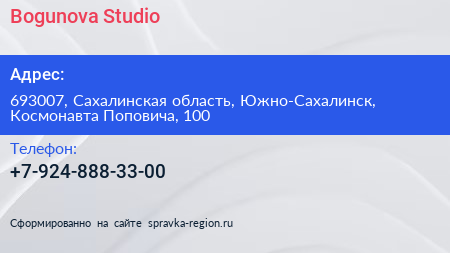 Bogunova Studio по адресу 693007, Сахалинская область, Южно-Сахалинск, Космонавта Поповича, 100 в дальнейшем Организация, размещена в следующих категориях: