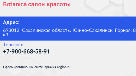 Botanica, салон красоты по адресу 693012, Сахалинская область, Южно-Сахалинск, Горная, 8 к3 в дальнейшем Организация, размещена в следующих категориях: