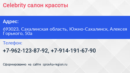 Celebrity, салон красоты по адресу 693023, Сахалинская область, Южно-Сахалинск, Алексея Горького, 50а в дальнейшем Организация, размещена в следующих категориях: