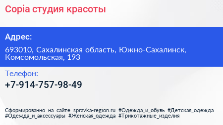 Copia, студия красоты по адресу 693010, Сахалинская область, Южно-Сахалинск, Комсомольская, 193 в дальнейшем Организация, размещена в следующих категориях: