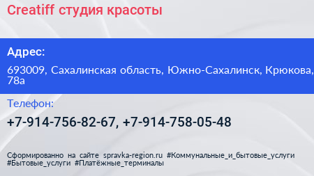 Creatiff, студия красоты по адресу 693009, Сахалинская область, Южно-Сахалинск, Крюкова, 78а в дальнейшем Организация, размещена в следующих категориях: