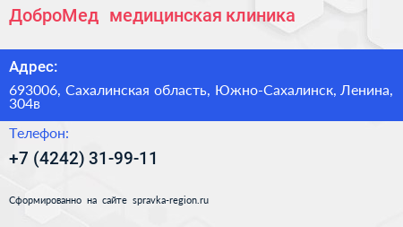 ДоброМед+, медицинская клиника по адресу 693006, Сахалинская область, Южно-Сахалинск, Ленина, 304в в дальнейшем Организация, размещена в следующих категориях:
