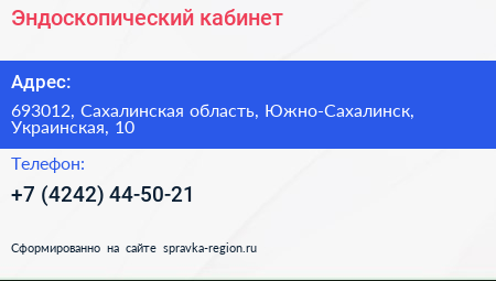 Эндоскопический кабинет по адресу 693012, Сахалинская область, Южно-Сахалинск, Украинская, 10 в дальнейшем Организация, размещена в следующих категориях: