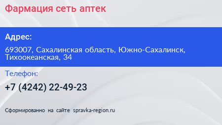 Фармация, сеть аптек по адресу 693007, Сахалинская область, Южно-Сахалинск, Тихоокеанская, 34 в дальнейшем Организация, размещена в следующих категориях: