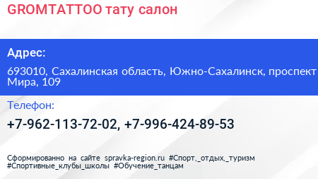 GROMTATTOO, тату-салон по адресу 693010, Сахалинская область, Южно-Сахалинск, проспект Мира, 109 в дальнейшем Организация, размещена в следующих категориях:
