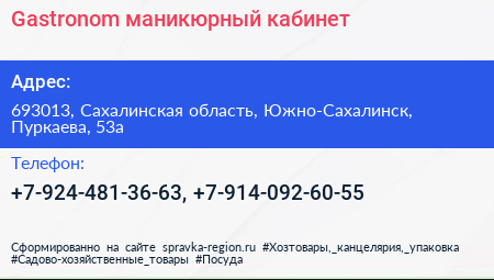 Gastronom, маникюрный кабинет по адресу 693013, Сахалинская область, Южно-Сахалинск, Пуркаева, 53а в дальнейшем Организация, размещена в следующих категориях: