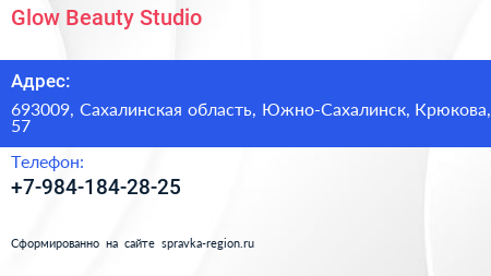 Glow Beauty Studio по адресу 693009, Сахалинская область, Южно-Сахалинск, Крюкова, 57 в дальнейшем Организация, размещена в следующих категориях:
