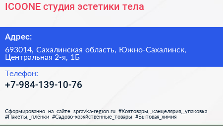 ICOONE, студия эстетики тела по адресу 693014, Сахалинская область, Южно-Сахалинск, Центральная 2-я, 1Б в дальнейшем Организация, размещена в следующих категориях: