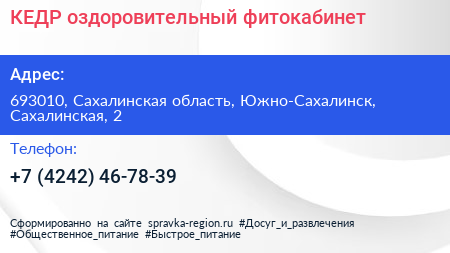 КЕДР, оздоровительный фитокабинет по адресу 693010, Сахалинская область, Южно-Сахалинск, Сахалинская, 2 в дальнейшем Организация, размещена в следующих категориях: