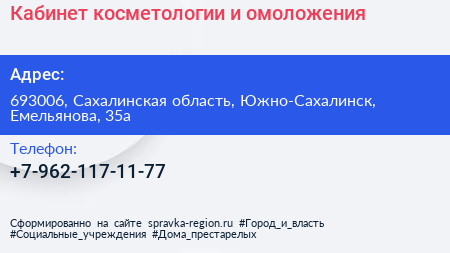 Кабинет косметологии и омоложения по адресу 693006, Сахалинская область, Южно-Сахалинск, Емельянова, 35а в дальнейшем Организация, размещена в следующих категориях: