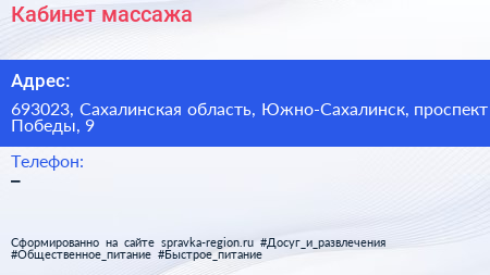 Кабинет массажа по адресу 693023, Сахалинская область, Южно-Сахалинск, проспект Победы, 9 в дальнейшем Организация, размещена в следующих категориях:
