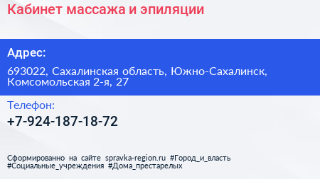 Кабинет массажа и эпиляции по адресу 693022, Сахалинская область, Южно-Сахалинск, Комсомольская 2-я, 27 в дальнейшем Организация, размещена в следующих категориях: