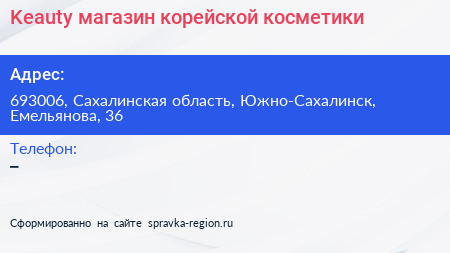 Keauty, магазин корейской косметики по адресу 693006, Сахалинская область, Южно-Сахалинск, Емельянова, 36 в дальнейшем Организация, размещена в следующих категориях: